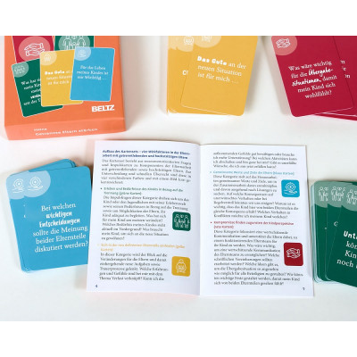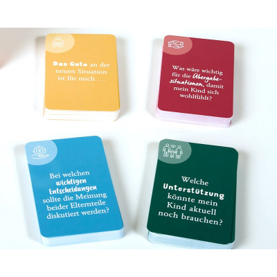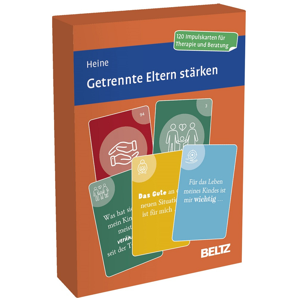 Eine Krise oder Trennung der Eltern ist für Kinder und Jugendliche ein einschneidendes Lebensereignis. Da bei frisch getrennten oder hochstrittigen Elternteilen oft eine hohe Emotionalität aktuelle Entscheidungen und Handlungen beeinflusst, verlieren die Eltern leicht die Bedürfnisse und Gefühle der Kinder aus dem Blick. »Was soll unser Kind von uns Eltern erfahren? Welches Bedürfnis unseres Kindes steht aktuell im Vordergrund? Wie bleibe ich als Elternteil präsent für mein Kind?« Die 120 Impulsfragen dienen Eltern zur Reflexion über ihre Elternrolle und können sie dabei unterstützen, zu lernen, sich zugunsten des Kindes von ihren negativen Gefühlen gegenüber der Ex-Partner_innen abzugrenzen. Das Kartenset besteht aus Fragen und Impulskarten zu vier Wirkfaktoren in der Elternarbeit mit strittigen oder getrennt lebenden Eltern: • Erleben und Bedürfnisse des Kindes in Bezug auf die Trennung • Sich in der neu definierten Elternrolle einfinden • Gemeinsame Werte und Ziele der Eltern • Kompromisse finden zugunsten der Kindperspektive Die Karten können in Psychotherapie und Beratung und jedem Setting der Elternarbeit eingesetzt werden.