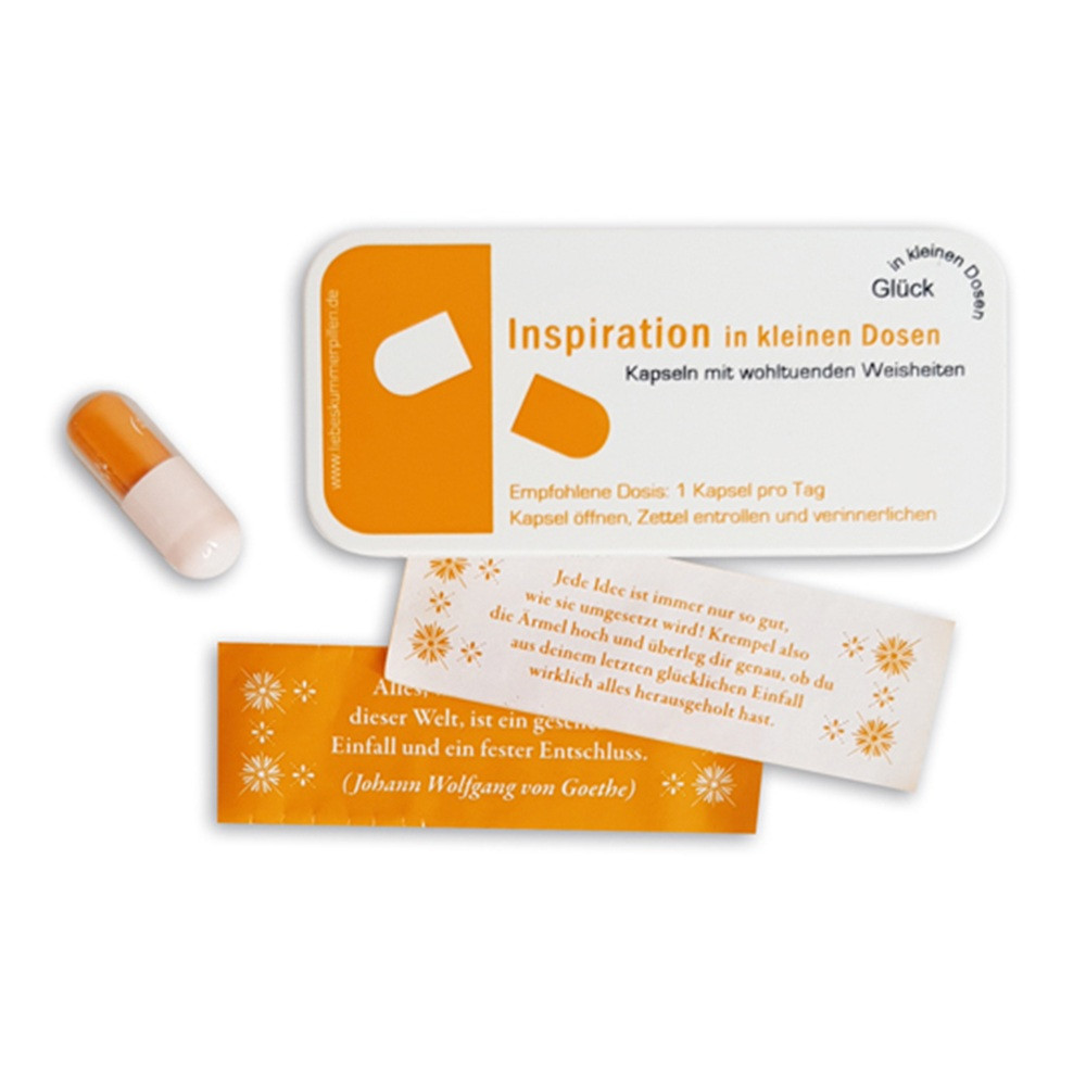 Das sind 7 Kapseln mit wohltuenden Weisheiten und Glücksgutscheinen zum Selbermachen für schöne Momente. Eine kleine Dosis für jeden Tag der Woche. Macht einfach glücklich! Inhalt: 7 Kapseln mit wohltuenden Weisheiten in der Pillendose