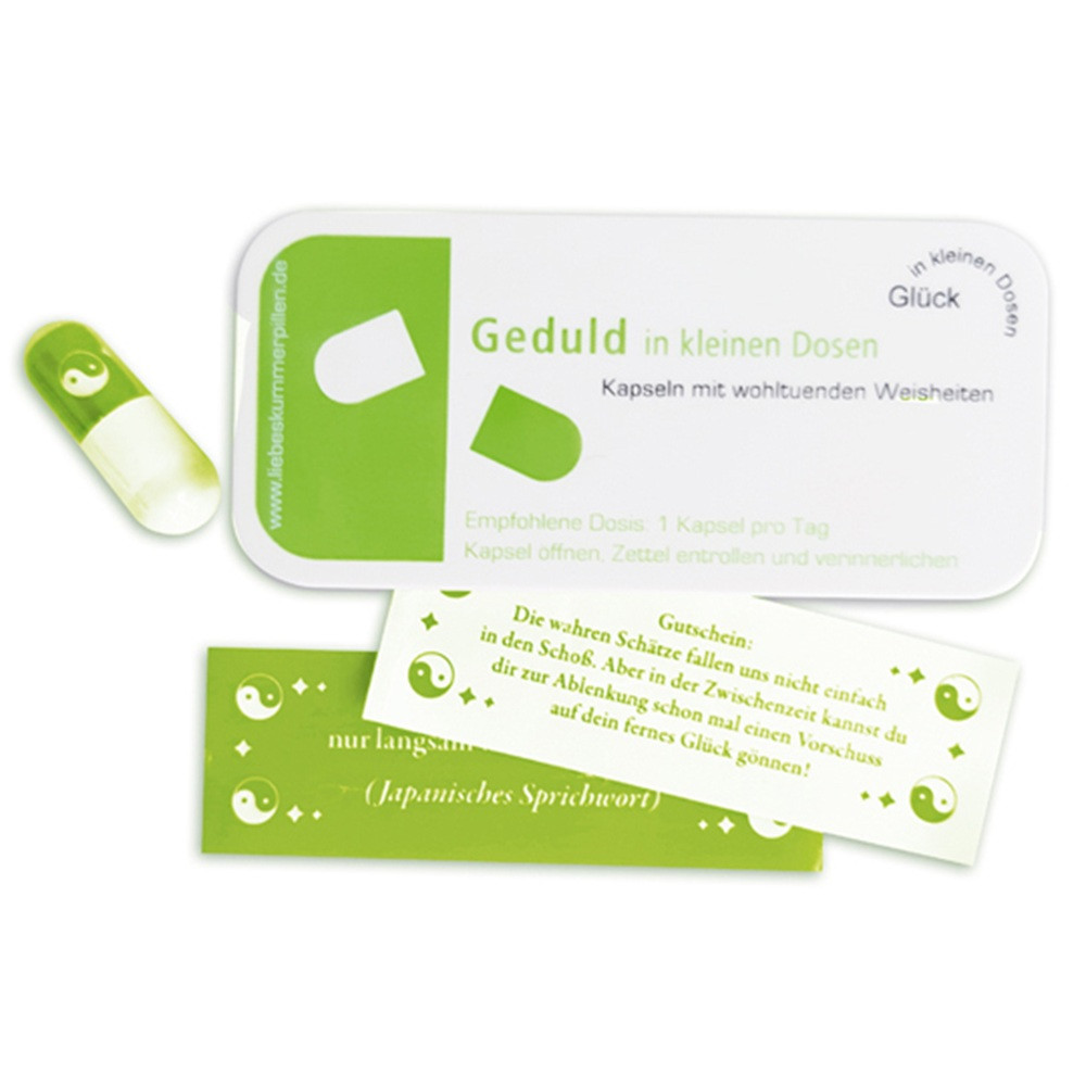 Das sind 7 Kapseln mit wohltuenden Weisheiten und Glücksgutscheinen zum Selbermachen für schöne Momente. Eine kleine Dosis für jeden Tag der Woche. Macht einfach glücklich! Inhalt: 7 Kapseln mit wohltuenden Weisheiten in der Pillendose