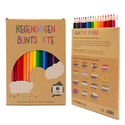 VIELFALT IST SCHÖN! Mit unseren Regenbogen-Buntstiften malen Kinder die Welt so vielfältig, wie sie wirklich ist. Ob knallige Pride-Flaggen, strahlende Regenbögen oder fantasievolle Kunstwerke – hier gibt es keine Grenzen! Beim Malen entdecken Kinder eine wichtige Botschaft: Die Menschen in unserer Gesellschaft, ihre Identitäten und Persönlichkeiten sind so unterschiedlich wie die fröhlichen Farben in unserem Malset.