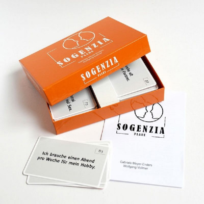 Sogenzia Paare ist ein Spiel mit 100 Textkarten mit Aussagen zu Einstellungen, Gefühlen, Träumen, Verhalten zu sich selbst und zum Geschehen innerhalb von intimen Partnerschaften.