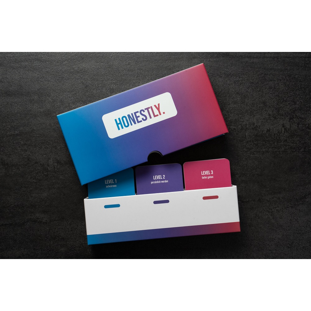 HONESTLY. ist ein Kartenspiel, das mit 150 Frage- und Actionkarten zu tieferen Gesprächen und Beziehungen führt. Drei Levels machen das Spiel immer persönlicher. Bist du bereit?