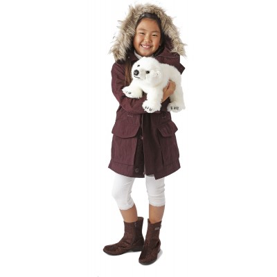 Kinder haben Spaß wenn sie das Maul und die Vorderbeine der Folkmanis Handpuppe kleiner Wolf animieren.